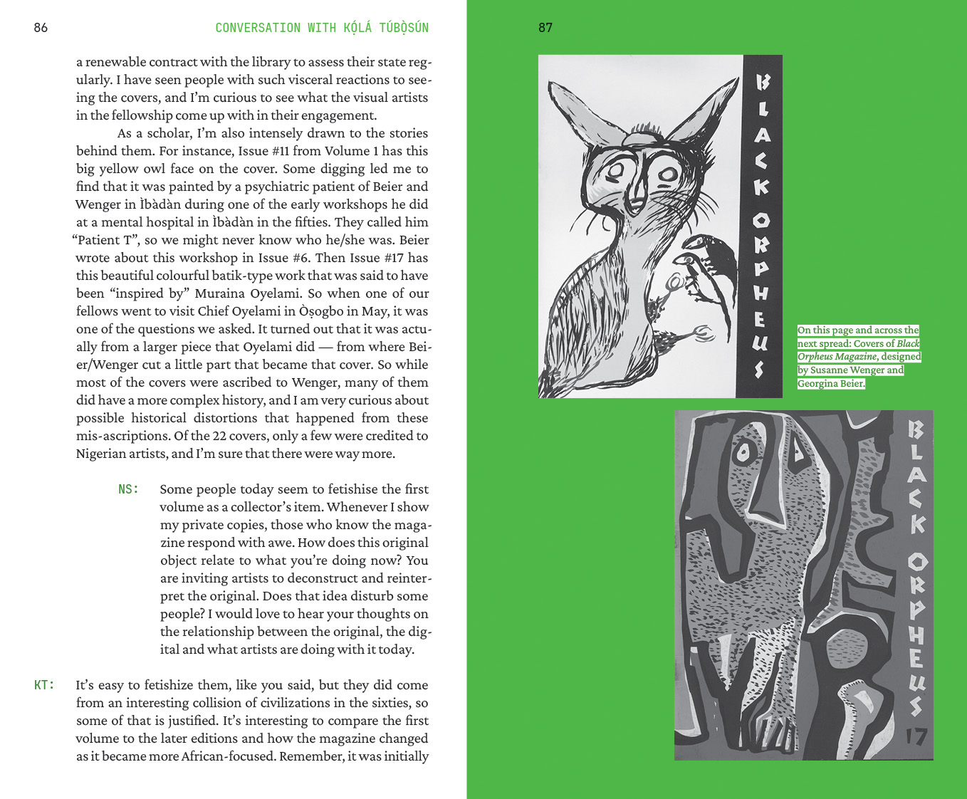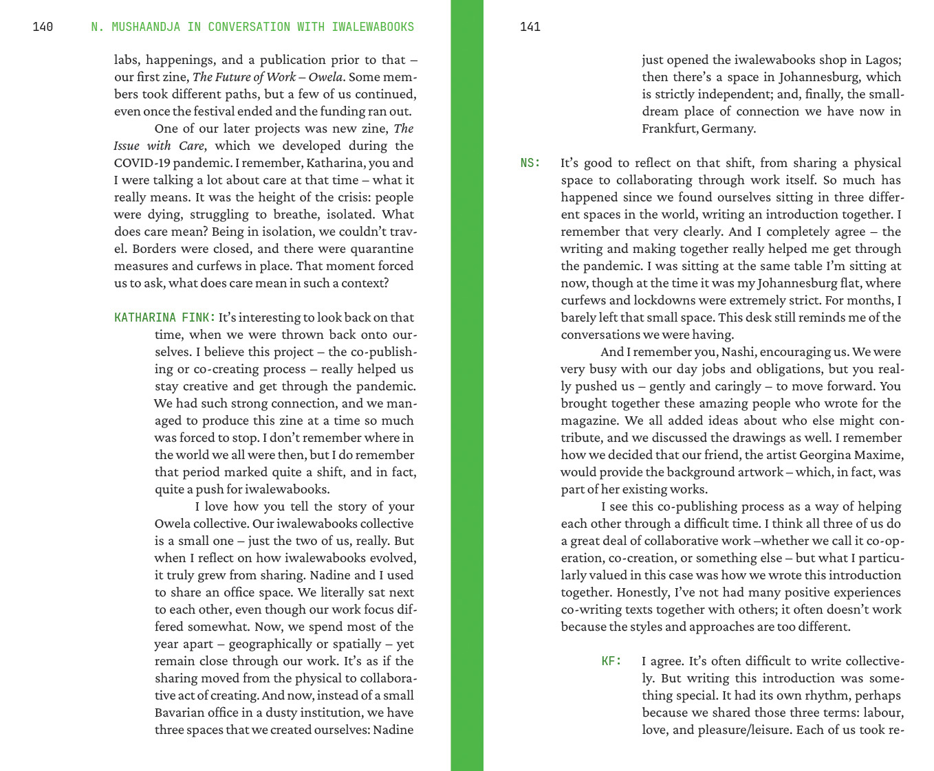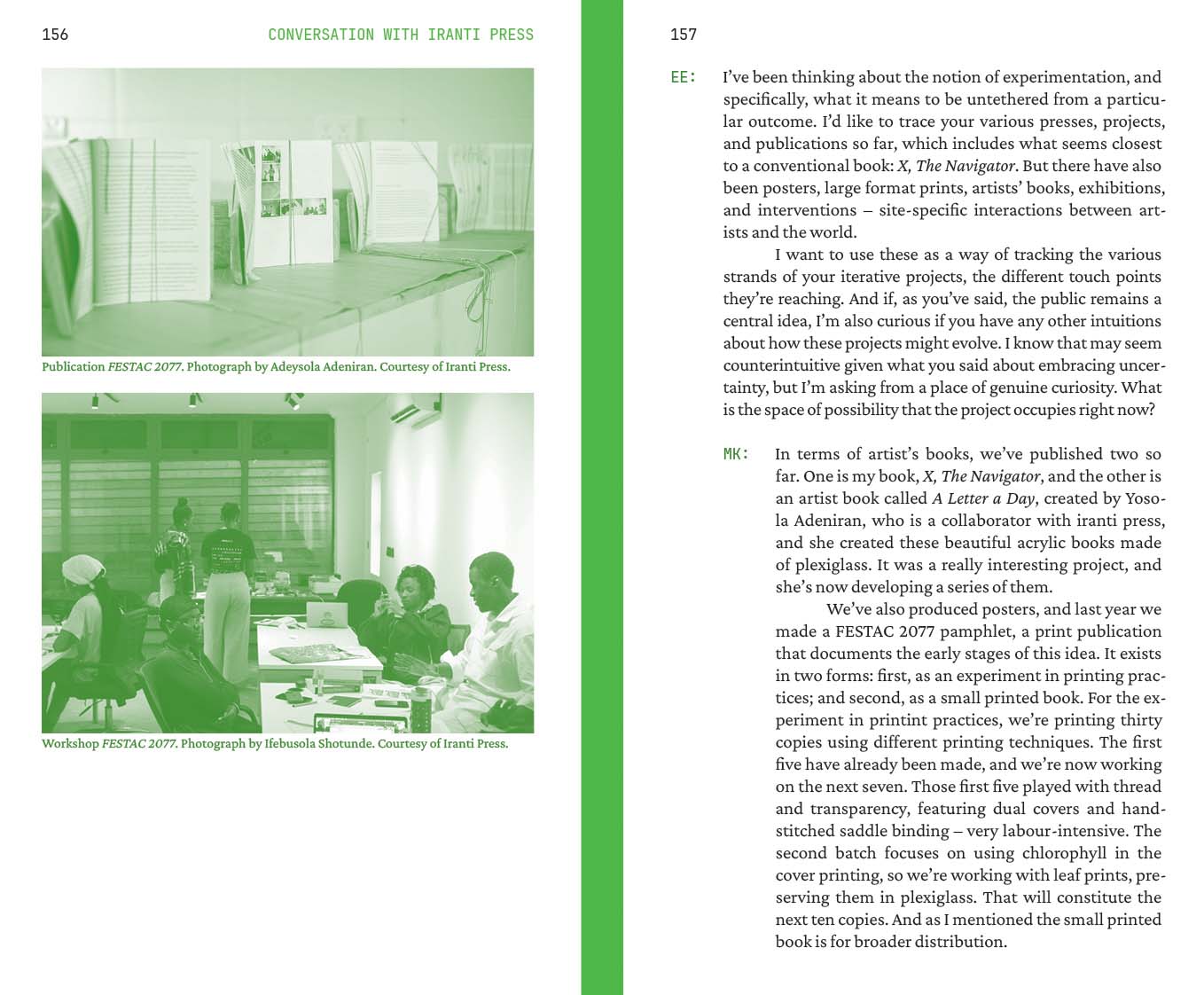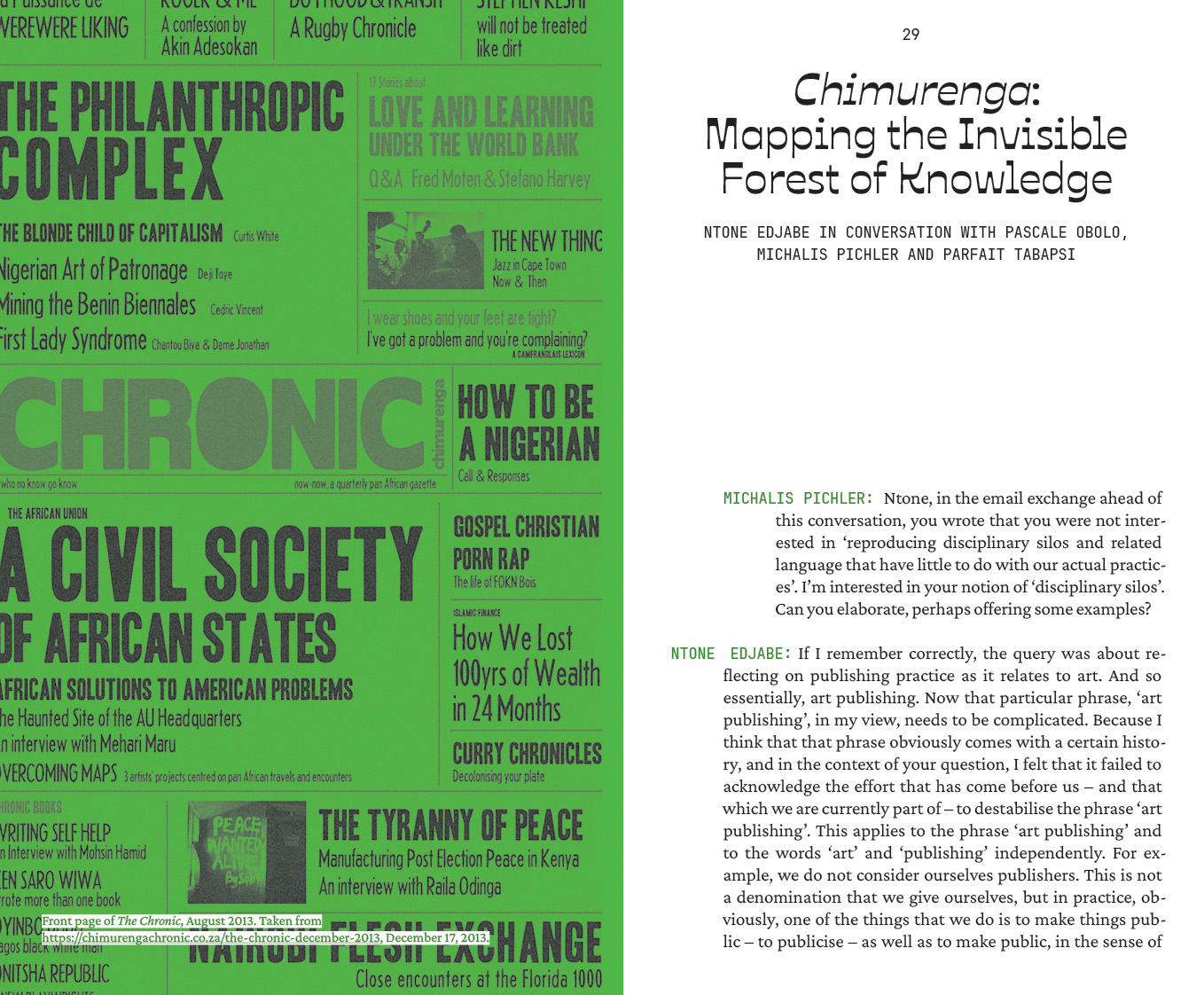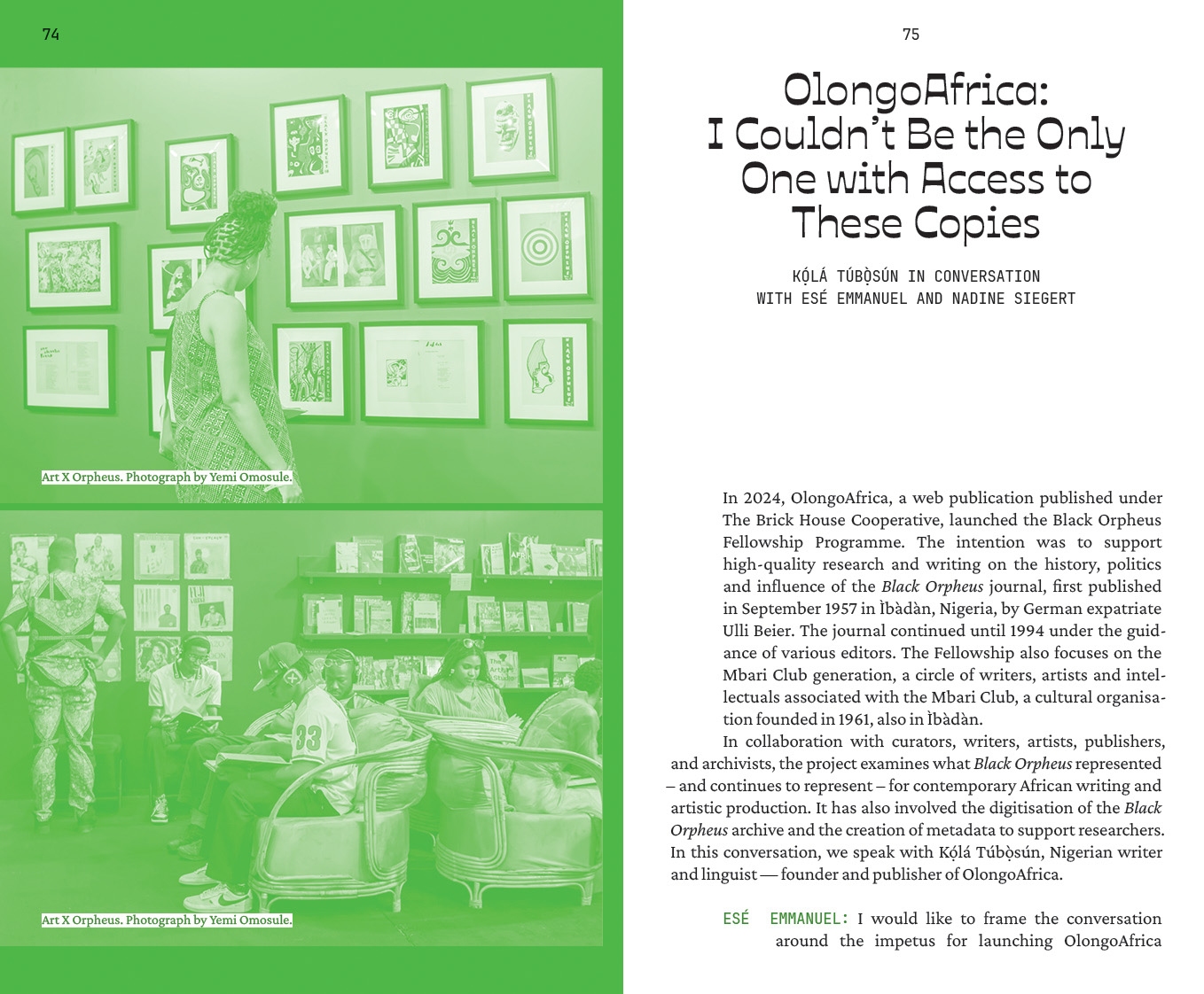 Managing Editors: Esé Emmanuel and Nadine Siegert. Contributions by: Naddya Adhiambo Oluoch-Olunya, Jeffery Atuobi, TJ Benson, Mongo Beti, Ntone Edjabe, Katharina Fink, Joseph Fometeu, Wanjeri Gakuru, Maryam Kazeem, Ambroise Kom, Serge D. Kouam, Queenzela Mokoena, Nashilongweshipwe Mushaandja, Nyakallo Phamuli, Mario Pissara, Omphemetse Ramatlhatse, Kọ́lá Túbọ̀sún, Ulrich Talla Wamba. Funded by: Goethe-Institut Nigeria as part of the project “We Make Books”, managed and coordinated by Esé Emmanuel and Nadine Siegert. The workshop “Co-Publishing Art Books in Africa” was supported by Goethe-Institut Kamerun and Thekla Worch-Ambara.